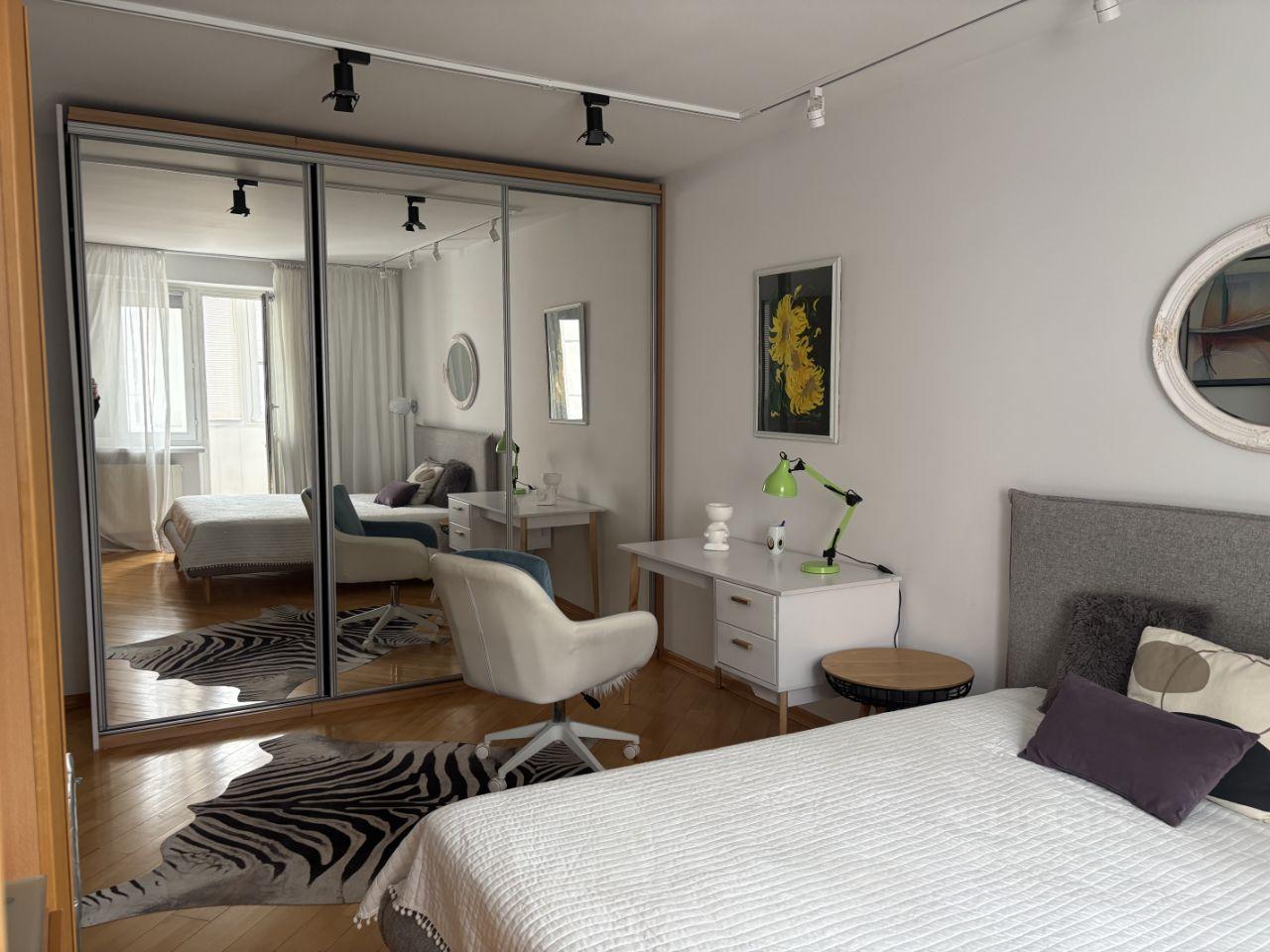 Квартира после косметического ремонта. На кухне установлена посудомоечная машина. Есть холодильник и микроволновая печь. В ванной установлена стиральная машина. Из мебели: кухонный гарнитур, двуспальная кровать с ортопедическим матрасом, зеркальный шкаф купе, комод, письменный стол.