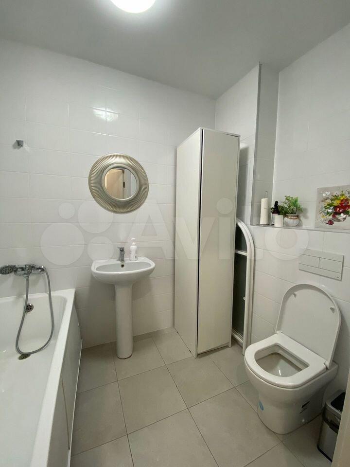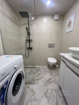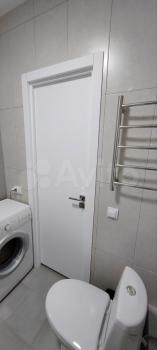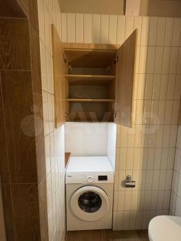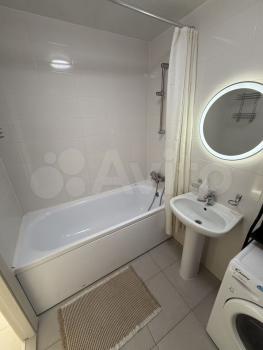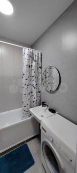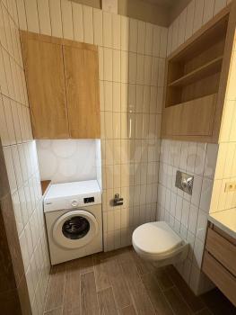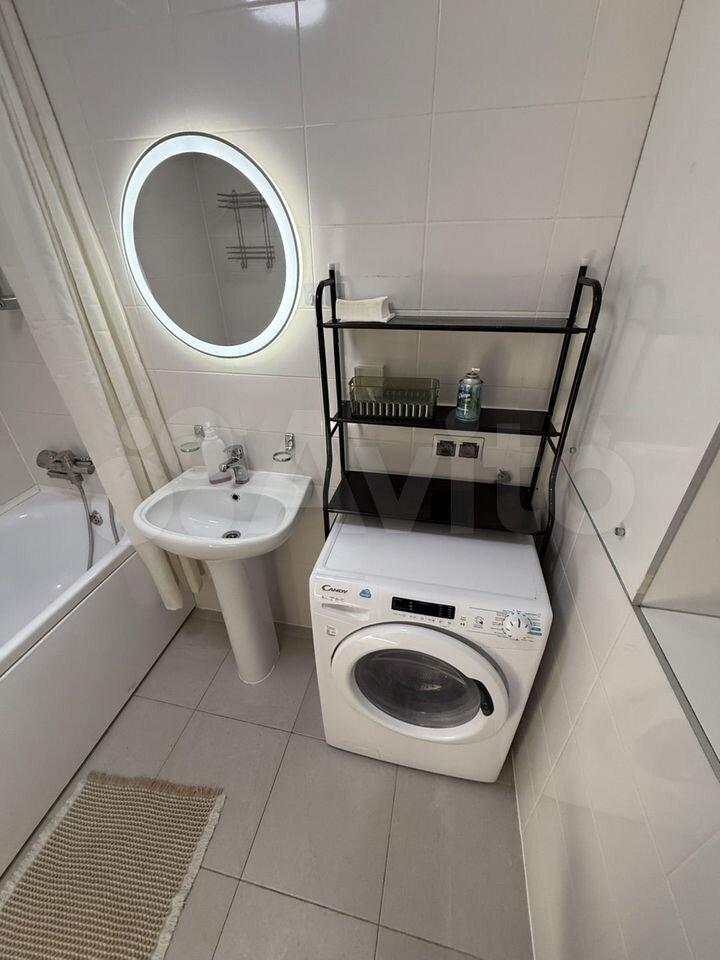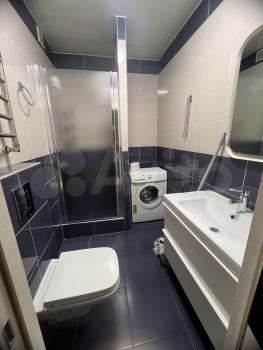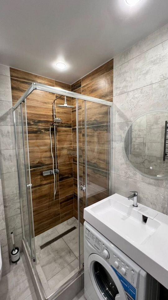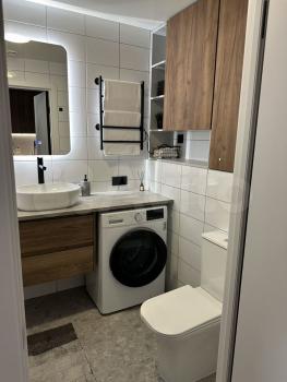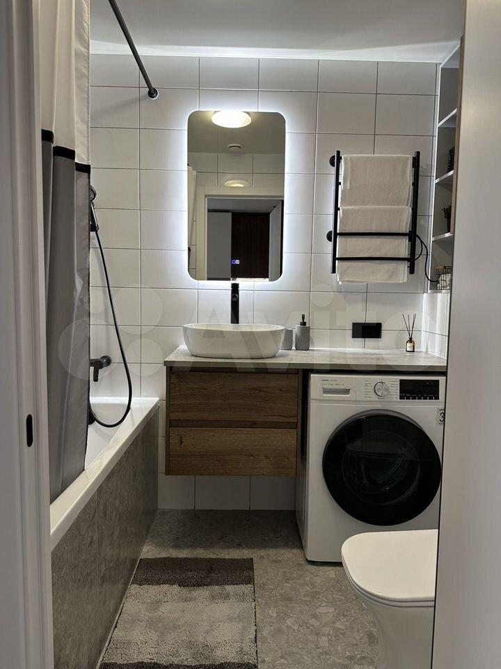 Ванная комната: новая сантехника, стиральная машина с функцией сушки, зеркало с подсветкой и подогревом, электрический полотенцесушитель, продуманные системы хранения.