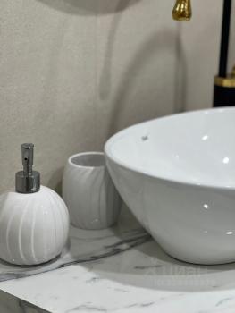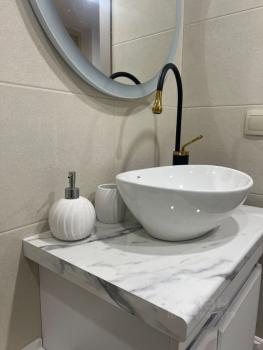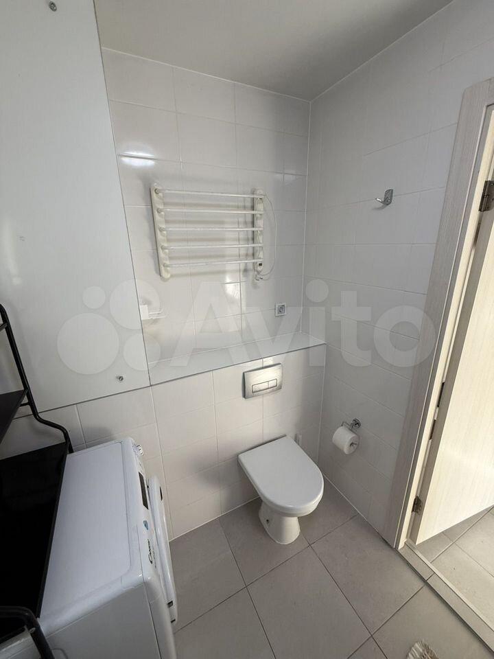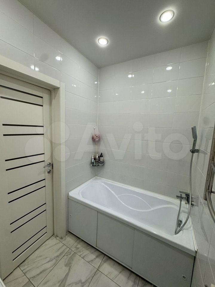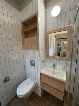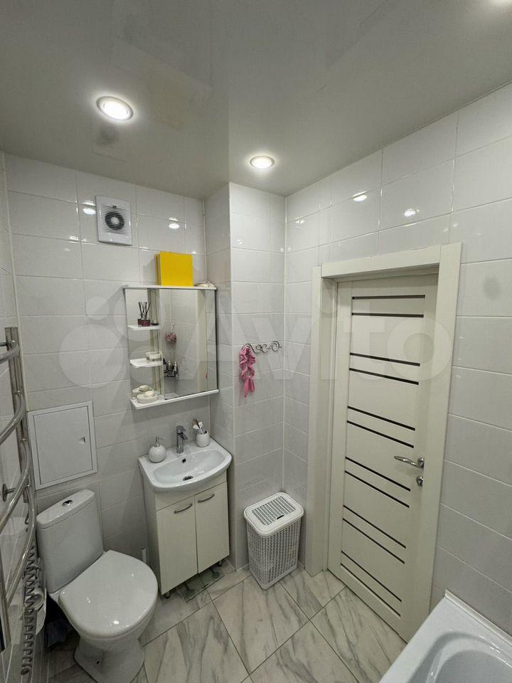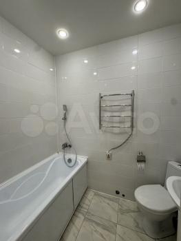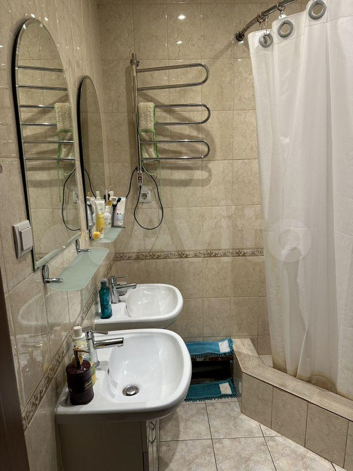 Ванная комната: новая сантехника, стиральная машина с функцией сушки, зеркало с подсветкой и подогревом, электрический полотенцесушитель, продуманные системы хранения.