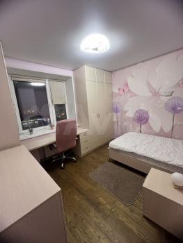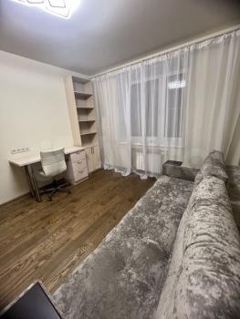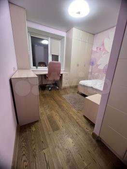 Комната 18 кв.м., с балконом. Окна и балкон - с современным стеклопакетом. Окна - на восток. Отопление хорошее. Пол - паркет. Диван-кровать, кровать-полуторка, письменные столы, шкаф-купе с зеркалом, трюмо для макияжа, комод, стулья, книжные полки.