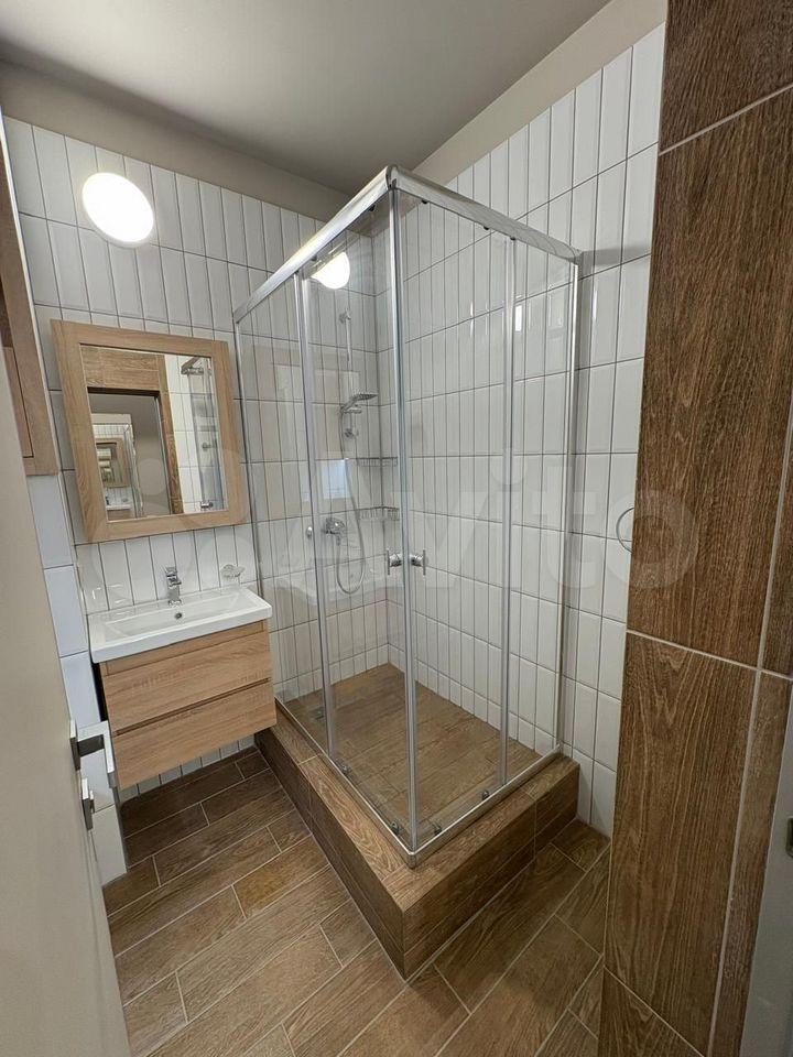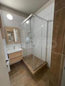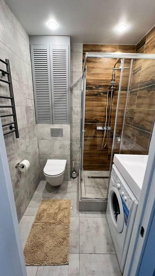 Санузел совмещённый, оборудован просторной душевой кабиной 90×130 см.
