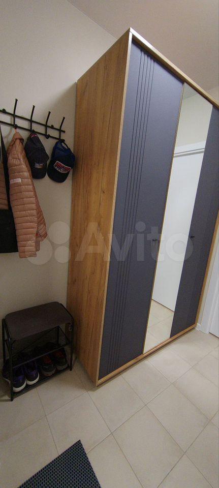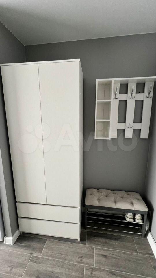 Прихожая: вместительный шкаф для верхней одежды, стеллаж, обувница, пуф с местом для хранения.