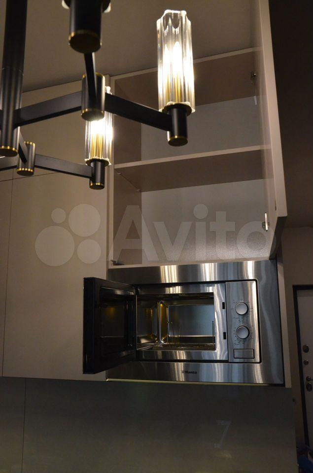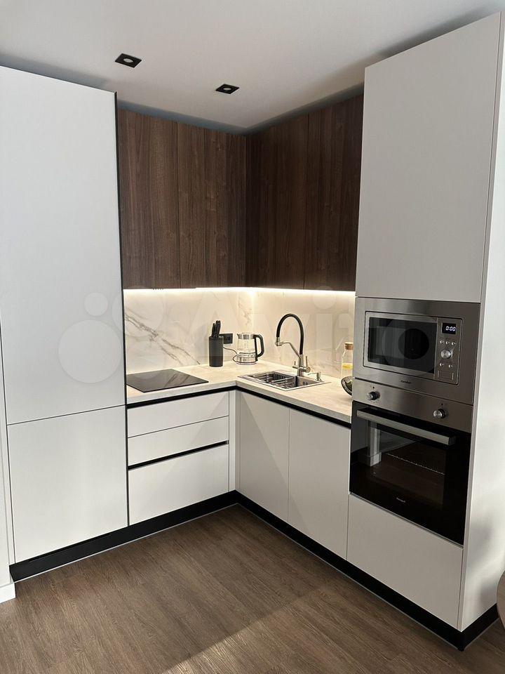 Кухня: просторный кухонный гарнитур с подсветкой, встроенная техника — холодильник, варочная панель, духовой шкаф, микроволновая печь, посудомоечная машина, установлен фильтр для воды, имеется посуда.