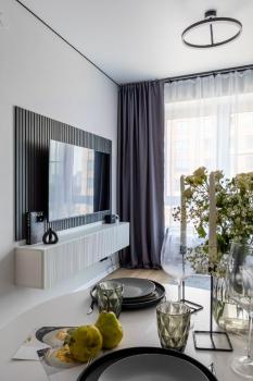 Квартира не загромождена и выглядит просторной. При этом вся мебель очень функциональна и позволяет разместить множество вещей и предметов домашнего обихода.