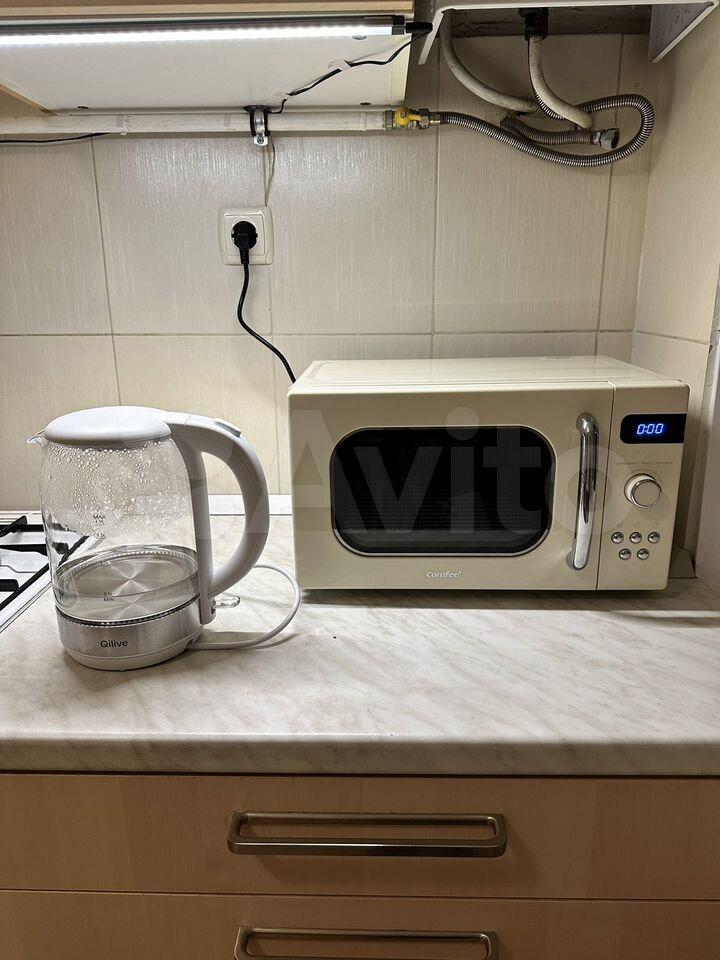 Техника: плита с духовкой, холодильник, телевизор, стиральная машина, микроволновая печь, чайник.