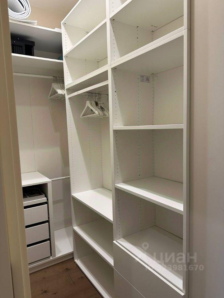Квартира имеет продуманную планировку с несколькими зонами хранения. Общая площадь — 41 м². Расположена на 25 этаже, из окон открывается вид на реку и Москва-Сити.