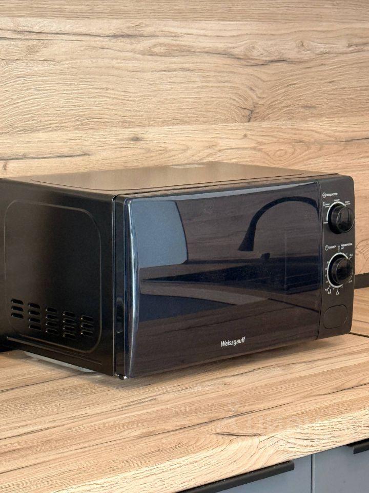 В квартире стиральная машинка, плита, микроволновая печка, холодильник, чайник.