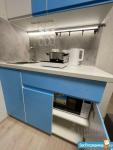 Всё включено, кухня, стиральная машина с сушкой, шкаф купе, холодильник no frost, вся бытовая техника, смарт тв, утюг, свч, всё для комфортной и удобной жизни. Только на долгий срок, залог 1 мес, договор на 11 месяцев. Без посредников. Кухня белая в синей плёнке.