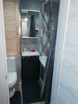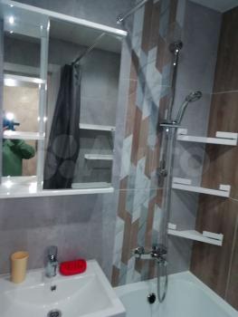 В ванной просторная душевая зона с разными режимами душа. Зеркальный шкаф с розеткой внутри для зубной щетки. Гигиенический душ, вытяжка, теплый пол с включением по расписанию, электрический проточный водонагреватель, два режима освещения.