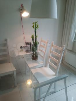 Красивая светлая квартира, много белого цвета и стекла. Есть вся необходимая для проживания мебель и бытовая техника, вместительные удобные шкафы. Очень близко от метро - 4 минуты пешком, супермаркет рядом с домом.
