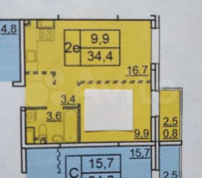 Планировка квартиры Е2, кухня гостинная - 16,7 кв.м, спальня - 9,9. Общая площадь - 34,4 кв.м включая балкон.