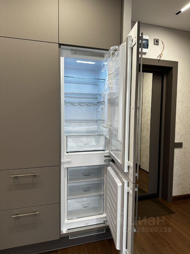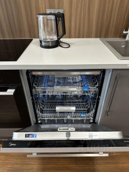 Качественная уютная кухня со встроенной техникой: посудомойка, варочная панель, духовой шкаф, двухкамерный холодильник с морозильником. Все новое. Барная стойка с высокими стульями.