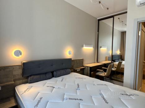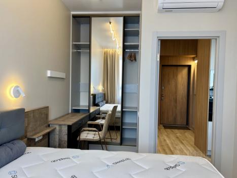 Отдельная спальня с двуспальной кроватью шир.1.6 м. Есть выделенное рабочее место с кабельным высокскоскоростным интернетом. Функциональная гардеробная с бесконтактной подсветкой.