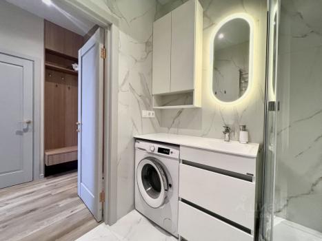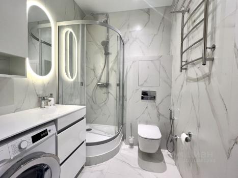 В помещении санузла душевая кабина с тропическим душем, стиральная машина, теплые полы, установлен водонагреватель.