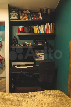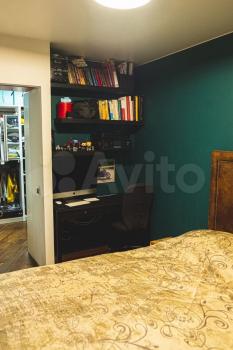 Хороший матрас и кровать, удобная продуманная гардеробная, зеркало с подсветкой. Есть комод для хранения вещей и письменный стол.
