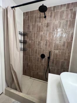 - ванная комната с тропическим душем, каменной столешницей и подвесным туалетом.