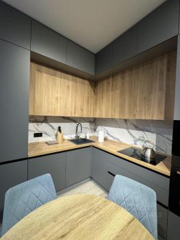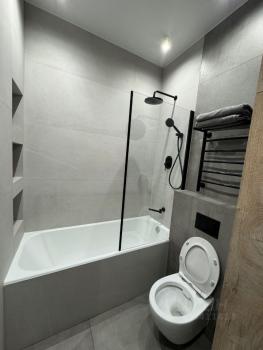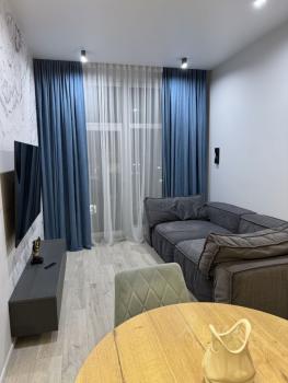Квартира выполнена в дизайнерском стиле. В просторных кухне и комнате есть вся необходимая мебель, а также современная бытовая техника: холодильник, посудомоечная машина, телевизор (4К) и кондиционер. В совмещённом санузле установлена ванна, есть стиральная и сушильная машины. В квартире есть два балкона.