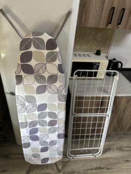 Есть все необходимое для проживания: холодильник, стиральная машинка, СВЧ, телевизор, электроплита , чайник, гладильная доска, утюг, сушилка для белья.