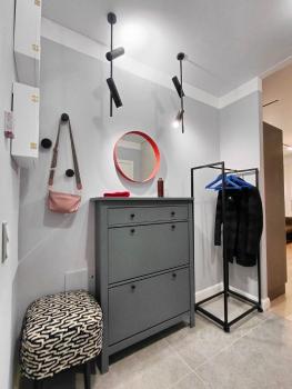 В квартире выполнен качественный дизайнерский ремонт и установлена современная мебель, как на кухне, так и в комнате. Из техники есть всё необходимое для комфортного проживания: кондиционеры, холодильник, посудомоечная и стиральная машины, телевизор. На период отключения воды предусмотрен водонагреватель. В санузле установлена душевая кабина.