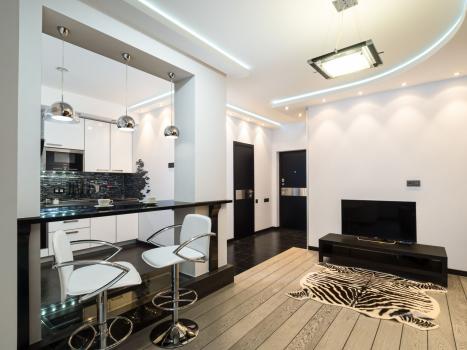 Кухня-гостиная - куxонный гаpнитур (плита, духовой шкаф, холодильник), телевизор 43 дюйма, рacкладной диван, обeденный cтoл, стулья.