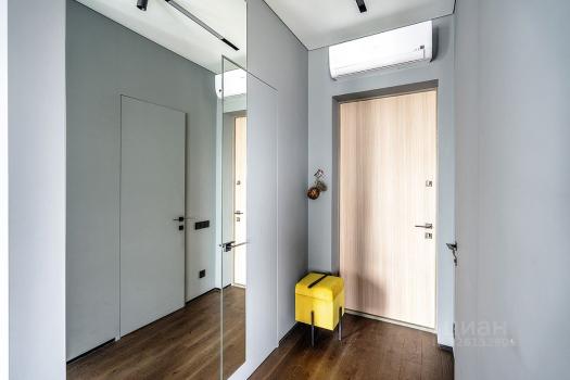 В коридоре располагается огромный шкаф купе с большими зеркалами и большой вместимостью.