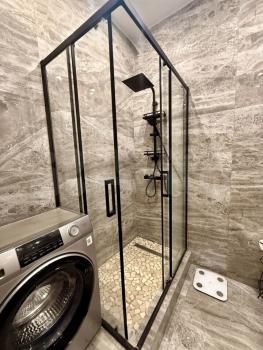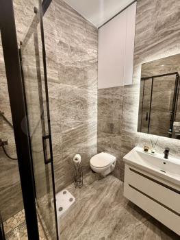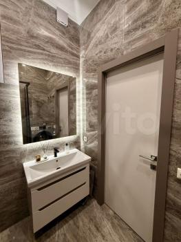 Ванная комната оборудована душевой кабиной, большим зеркалом с подсветкой, тумбой для хранения с раковиной и совмещена с санузлом