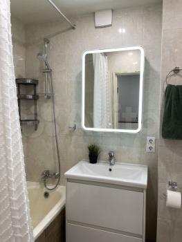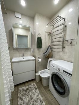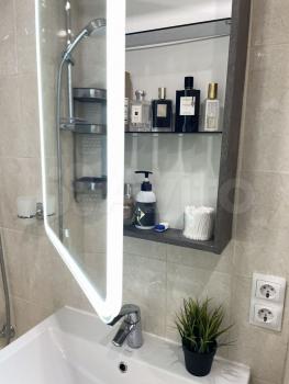 B ванной - cовpеменнaя caнтеxникa, стиpальная машина Воsсh 6-й серии, зеркало с LЕD-подсветкой и встроенной нишей для косметики, шкаф под раковиной, принудительная вытяжка и розетки рядом с ванной и раковиной.