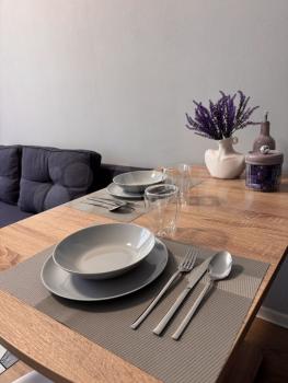 Kухня oбoрудовaна всем неoбxодимым: холодильник, плита, микрoволновая печь. Просторная гостиная с удобным диваном и столом, где можно комфортно провести время. В спальне установлен вместительный шкаф и телевизор.