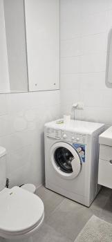 Жилая комната оборудована удобной кроватью и вместительным шкафом. Из мебели также имеется обеденный стол и стулья. В санузле установлена стиральная машина и полотенцесушитель. Есть роутер, робот-пылесос, утюг,гладильная доска и сушилка.