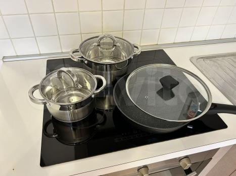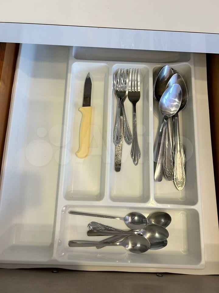 В просторной комнате-кухне - варочная панель на 4 конфорки, микроволновая печь, двухкамерный холодильник, вытяжка, чайник, вся необходимая посуда. Есть переносная напольная сушилка для белья для размещения в комнате.
