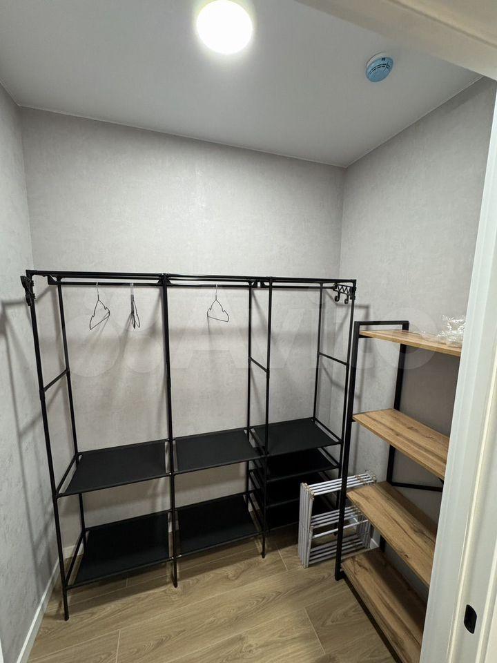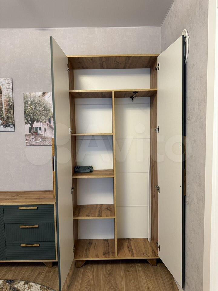 Установлена открытая система хранения, есть большая вешалка штанга для одежды, полки, пылесос, вешалка с крючками