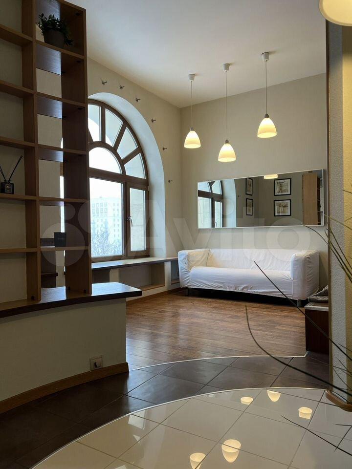 Небольшая гардеробная комната, просторная кухня и спальня-альков с видом на огромное арочное окно.
