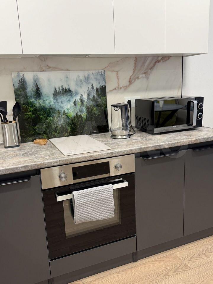 Квартира полностью укомплектована мебелью и техникой. Есть кондиционер, стиральная машина, холодильник, микроволновая печь, варочная панель, духовой шкаф, телевизор.
