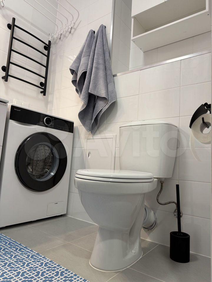 В квартире выполнен современный ремонт в светлых тонах. Благодаря удачной планировке студия ощущается как полноценная однокомнатная квартира.