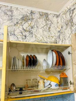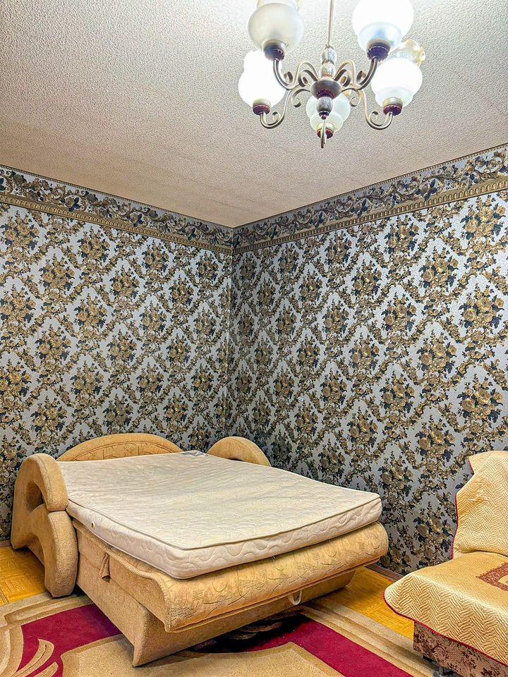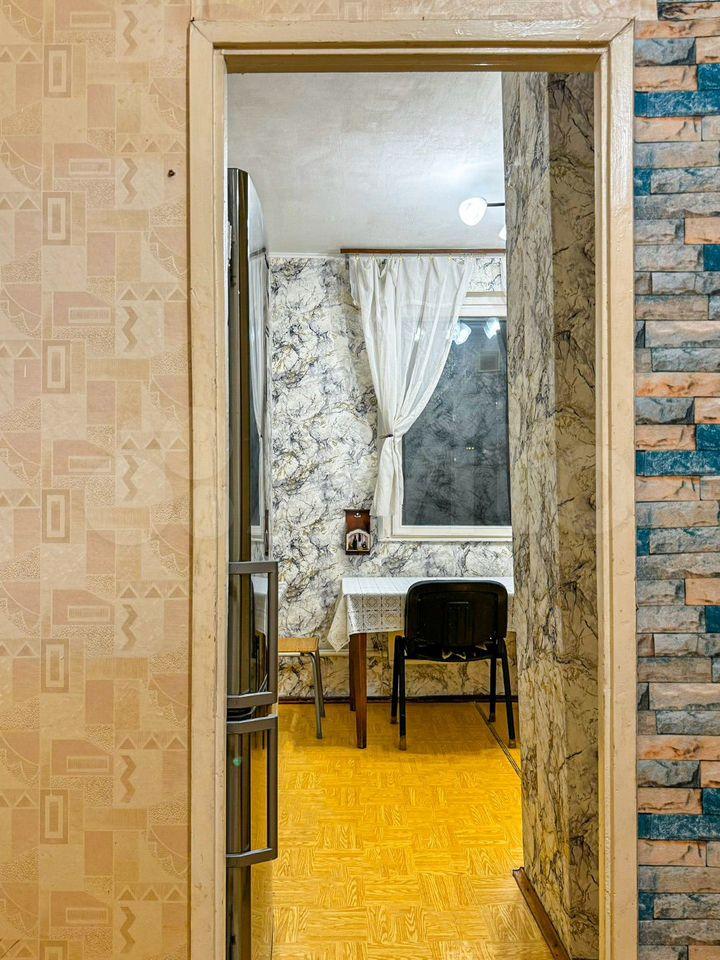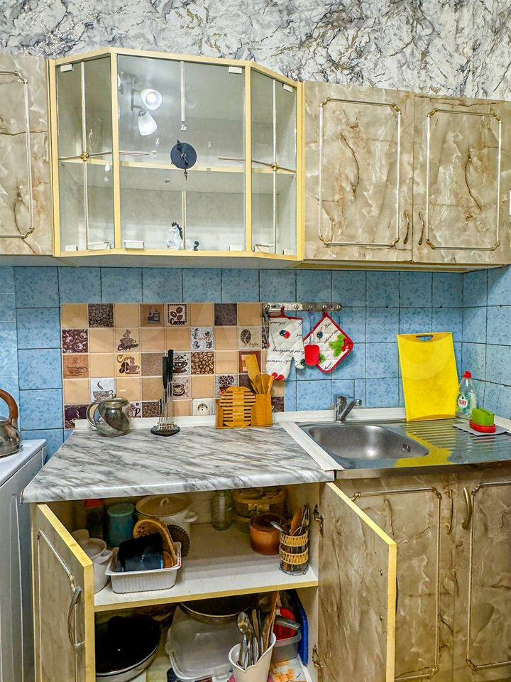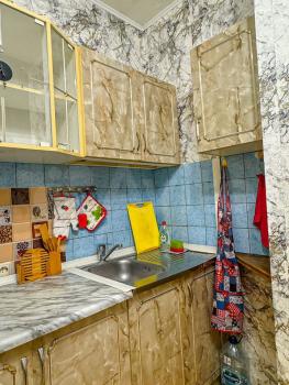 Кухня площадью 8 м² оборудована необходимой бытовой техникой, включая холодильник и плиту. Из мебели — вместительные шкафы и диван. В комнате установлен телевизор.