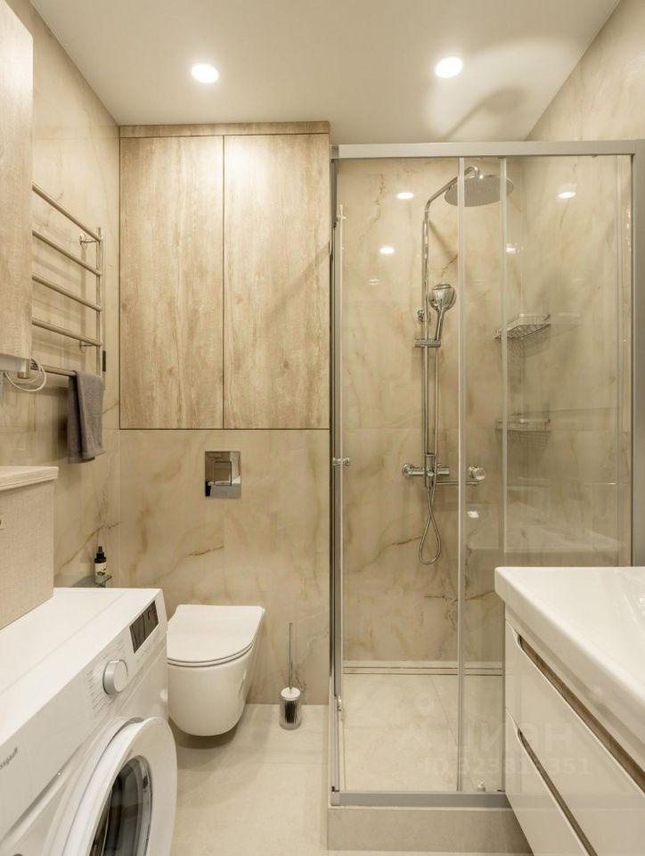 - Современная ванная комната со стиральной машиной,и сушилкой для полотенец.