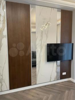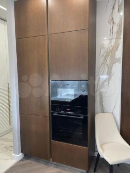 В комнате установлен кондиционер, имеется двух спальная кровать, вместительный шкаф и телевизор. Из мебели также есть обеденный стол и стулья, диван (Которого нет на фото). Кухня оснащена необходимой техникой: большой холодильник, индукционная плита на 4 конфорки, микроволновая печь, духовой шкаф и стиральная машина.