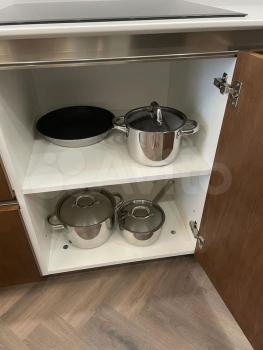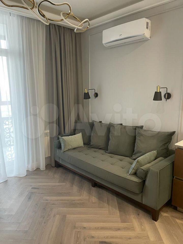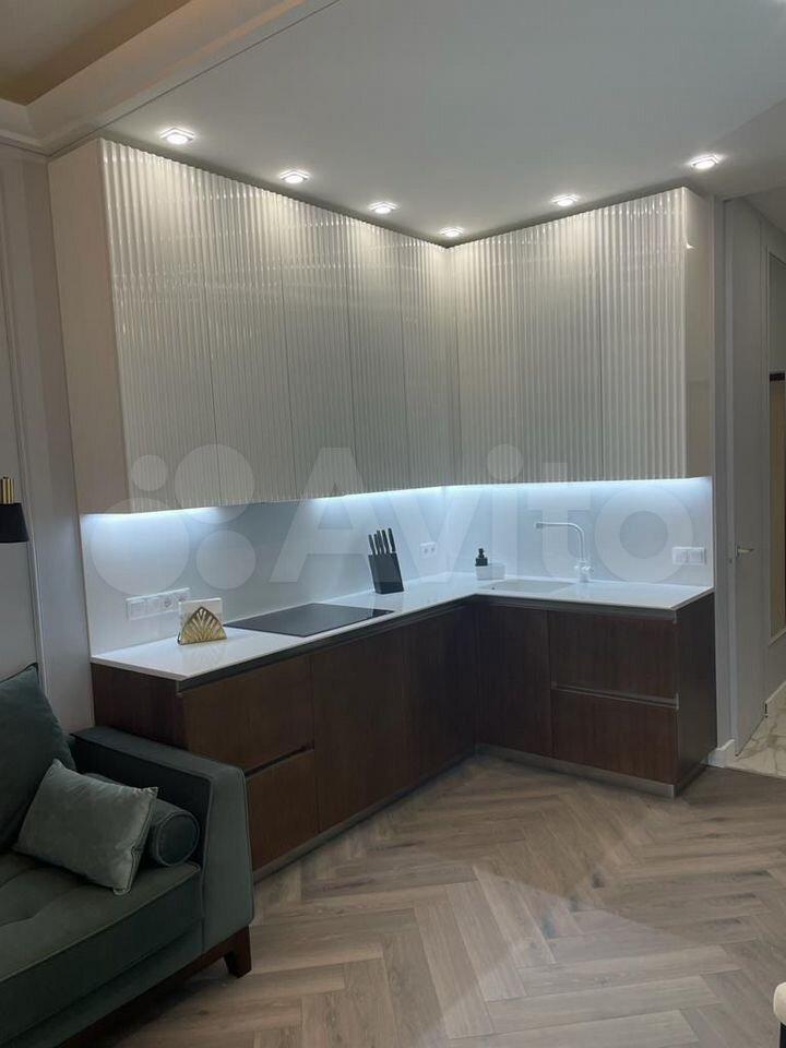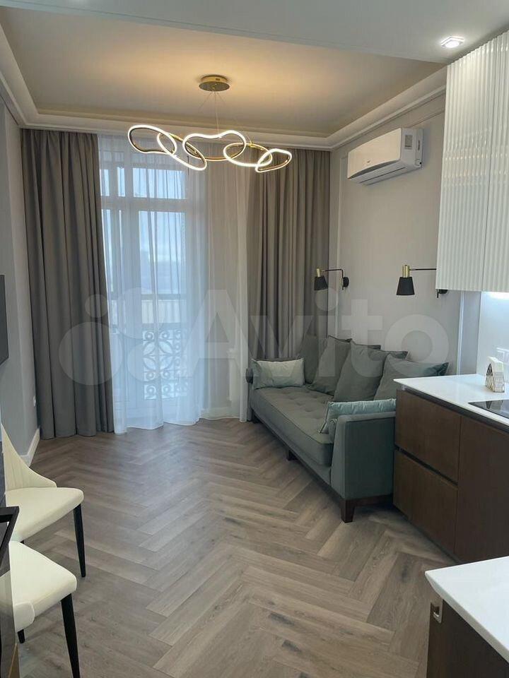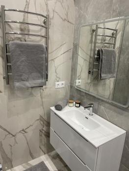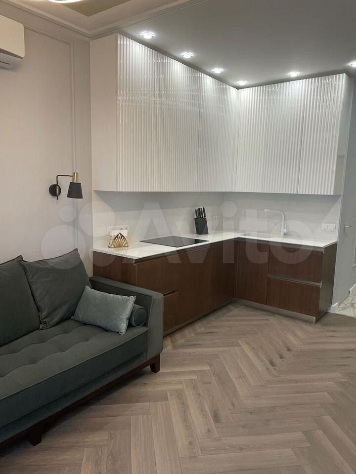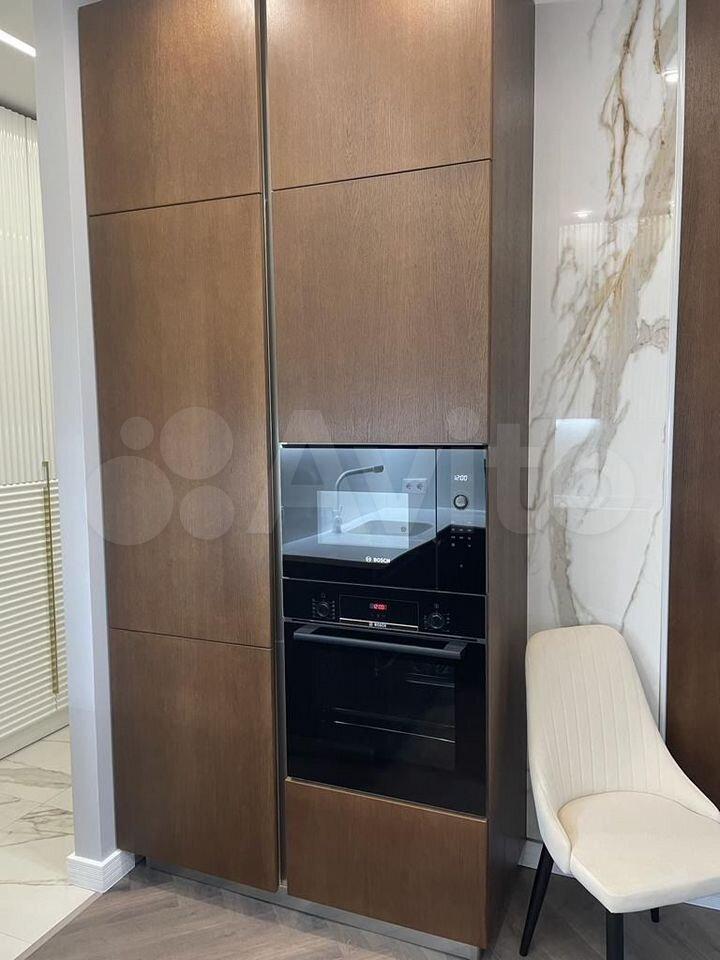 Апартаменты полностью укомплектованы мебелью и новой бытовой техникой премиум-брендов. Установлена встроенная кухня с холодильником, варочной панелью, духовым шкафом, посудомоечной машиной. Удобная двуспальная кровать, диван, обеденная зона и системы хранения.
