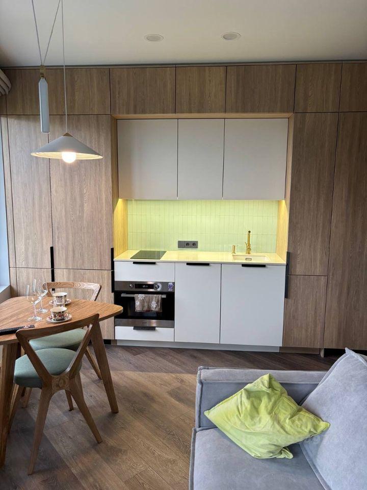 Просторная светлая кухня-гостиная, в которой установлена новая техника: холодильник, посудомоечная машина 45, индукционная плита, духовка, СВЧ-печь, телевизор 55 дюймов на андроид( в спальне на стене).