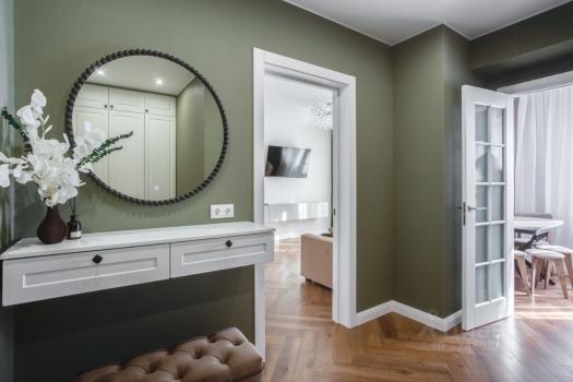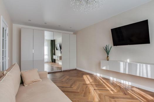 В квартире выполнен качественный ремонт, вся мебель абсолютно новая. Диван с ортопедическим основанием Askona, кондиционер, стиральная машина, два телевизора, холодильник, духовой шкаф, электрическая варочная панель. Много мест для хранения.