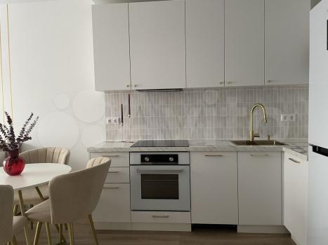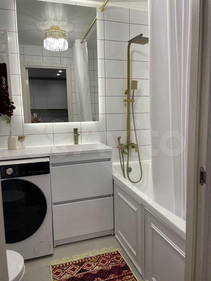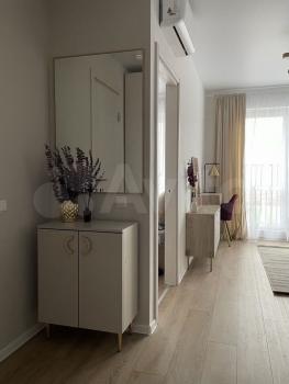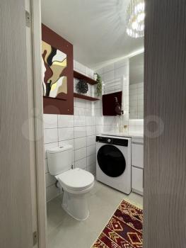 В квартире есть всё необходимое для комфортного проживания. Просторная комната обставлена мебелью, а на кухне установлена новая техника: кондиционер, холодильник, посудомоечная машина. Санузел совмещённый, установлена стиральная машина с сушкой.