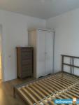 В спальне двуспальная кровать без матраса, шкаф и комод.