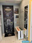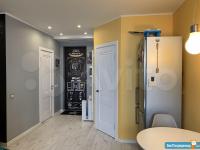 В квартире сделан дизайнерский ремонт - отделка кирпичом гостиной и душевой, грифельная стена для возможности рисовать мелом. Большая оборудованная гардеробная комната, в спальне - кровать-подиум, с большой зоной для хранения.