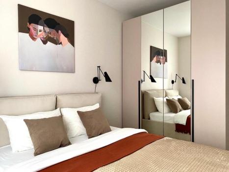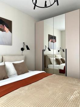 - изолированная спальня (двуспальная кровать с тумбой, светильниками и вместительным шкафом)