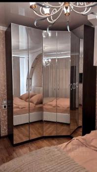 В спальне установлен полностью зеркальный модульный шкаф для вещей, кровать размерами 2х2 м. с большой системой хранения вещей , детский стол и стул, декоративная арка с отдельным освещением , кондиционер, телевизор Hyundai.