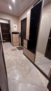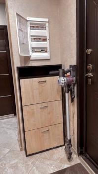 В коридоре установлен: встроенный раздвижной шкаф ; шкаф с зеркалом для хранения вещей; шкаф для обуви, видеодомофон competition с камерами наблюдения ,пылесос Dayson, теплый пол.