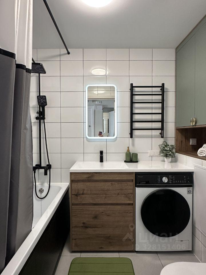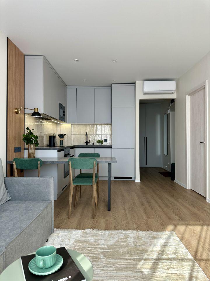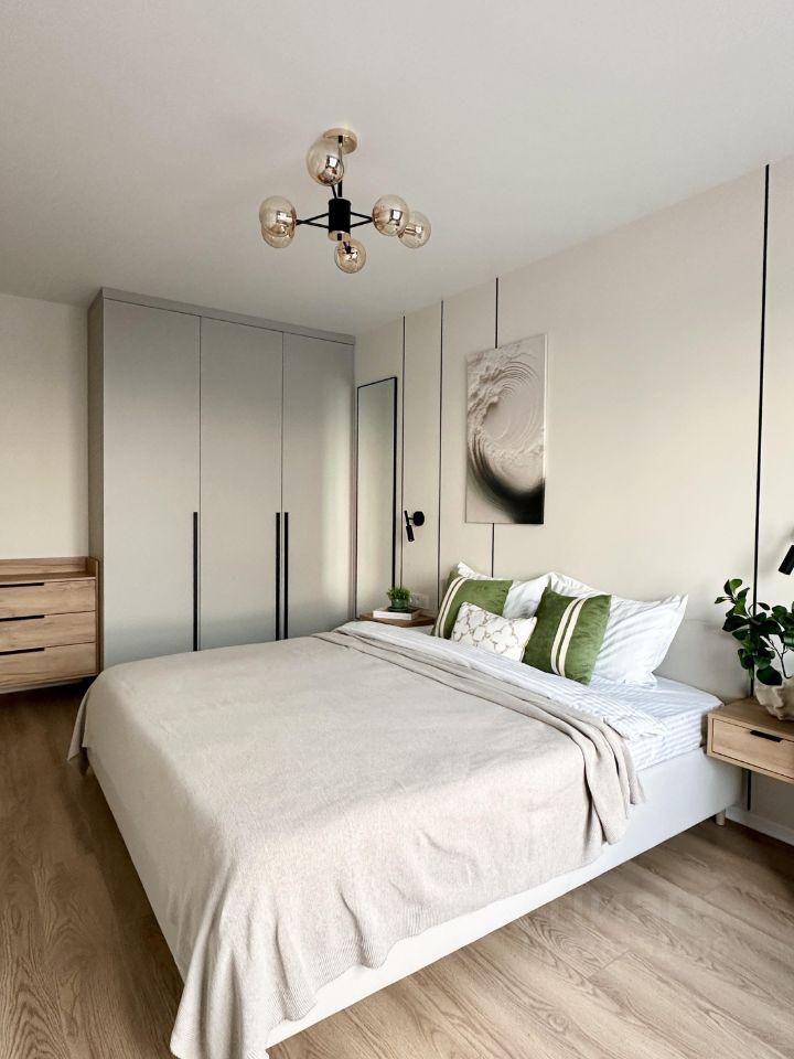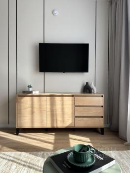 Квартира со свежим ремонтом, оборудована всей необходимой мебелью для комфортного проживания, есть кондиционер и стиральная машина, машина для сушки белья, кровать с ортопедическим матрасом, окна оборудованы кассетными жалюзи, в спальне — блэкаут.