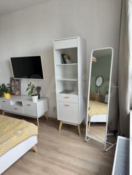 В спальне кровать 160х200 с ортопедическим матрасом, телевизор, зеркало напольное, рабочее место для компьютера, большой шкаф.