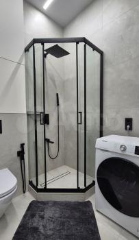 Санузлы оборудованы душевой кабиной, ванной, стиральной машиной, гигиеническим душем и системой от протечки воды. Во всей квартире уложена шумоизоляция, под плиткой установлен теплый пол.