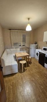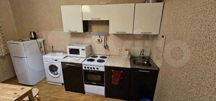 Квартира готова к проживанию. Здесь есть все необходимое для комфортного быта: в кухне и комнате имеется мебель, а также бытовая техника, включая холодильник и стиральную машину.